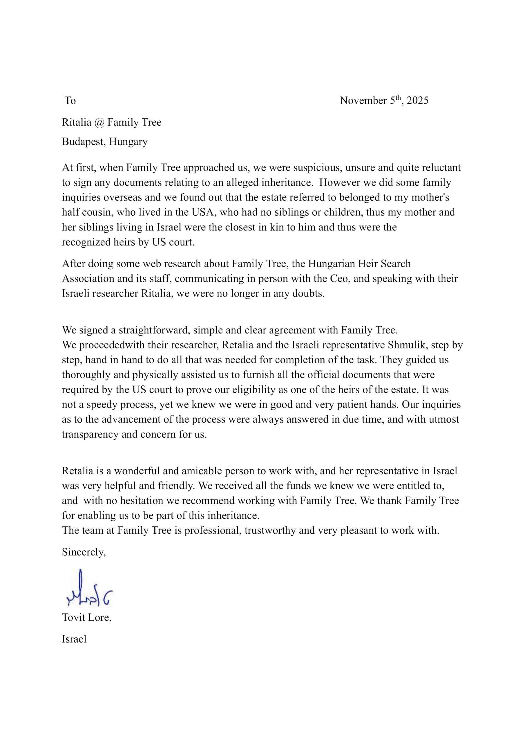 – משרד בינלאומי למחקר ירושות וצוואות, מייסד-שותף של האגודה ההונגרית לחיפוש יורשים (עץ המשפחה בע''מ רשומה תחת המספר 01 09 673 772 בבית המשפט לרישומים, בודפשט)